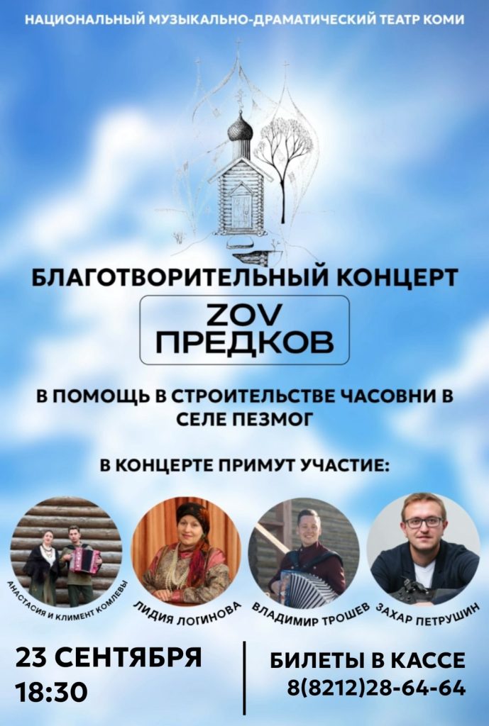 23 сентября в 18:30 в Национальном музыкально-драматическом театре Республики Коми состоится благотворительная концертная программа “ZOV ПРЕДКОВ”. Вечер будет приурочен к году Героев Отечества в России.