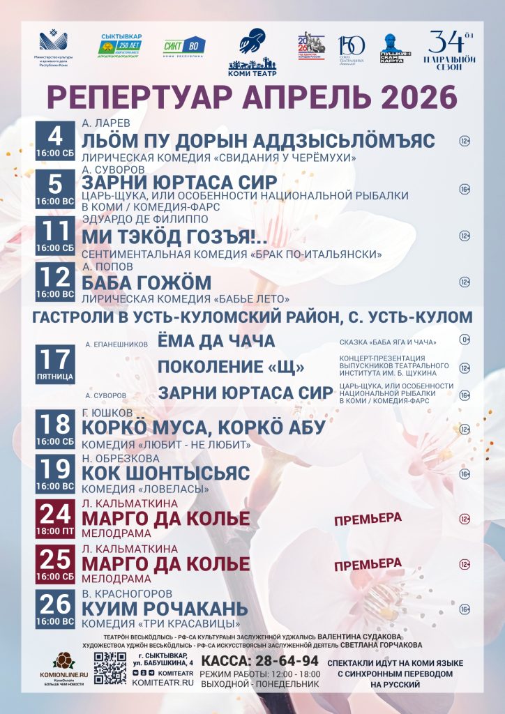 В рамках программы «Мастера искусств — селу» выезжаем в Усть-Куломский район! Зрителей ждут показы сказки «Ёма да Чача», концерта выпускников Театрального института им. Б. Щукина «Поколение «Щ» и спектакля «Зарни юртаса сир» (Царь-щука, или Особенности национальной рыбалки в Коми). Ждём вас!