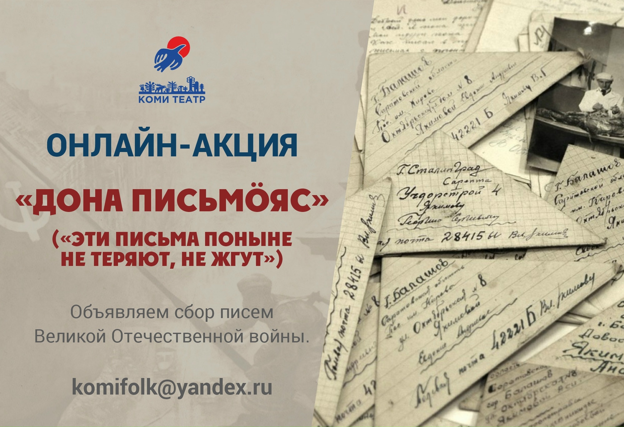 Дона видзӧдысьяс! Миян театр котыртӧ онлайн-акция «Дона письмӧяс» («Эти письма поныне не теряют, не жгут»).