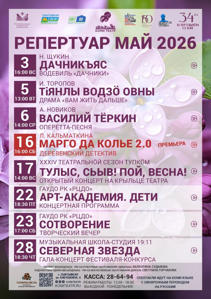 А 16 мая, 16:00 приглашаем на деревенский детектив «Марго да колье 2.0» по мотивам пьесы Ларисы Кальматкиной. Драматические коллизии и неожиданные повороты сюжета не дадут зрителю скучать! Ждём вас!17 мая закроет театральный сезон открытый концерт на крыльце нашего театра «Тулыс, сьыв!», посвящённый Дню коми языка и письменности.Делайте репосты, сохраняйте себе и рассказывайте друзьям