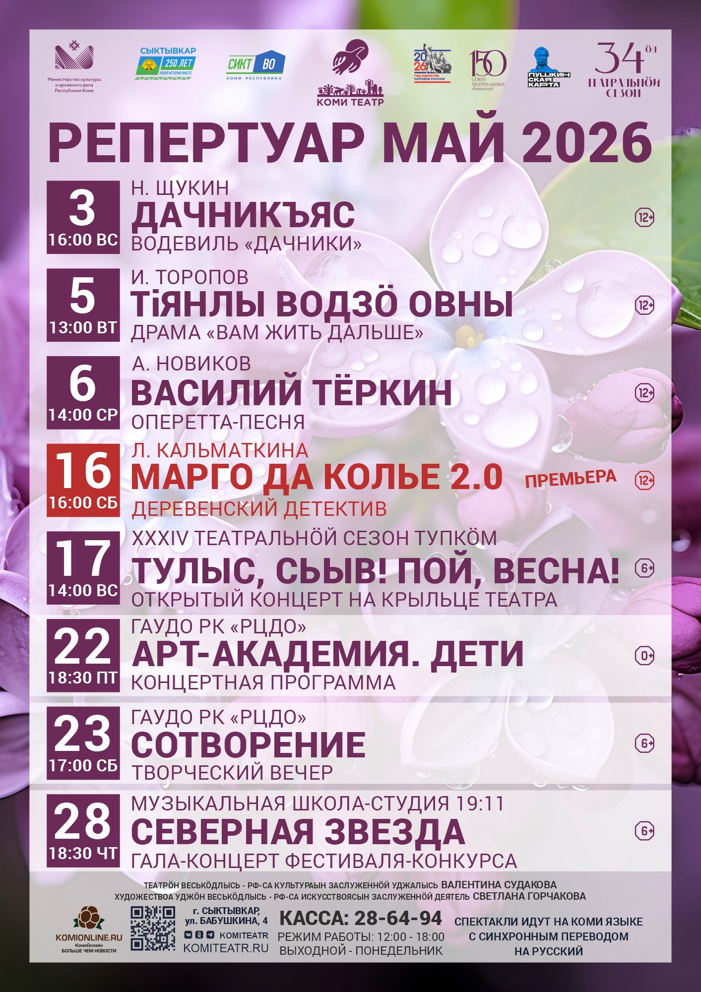 Кроме того, в нашем театре пройдут спектакли, приуроченные Дню Победы в Великой Отечественной войне — драма «Тiянлы водзӧ овны» (Вам жить дальше) по повести Ивана Торопова и оперетта-песня «Василий Тёркин» по мотивам поэмы Александра Твардовского.