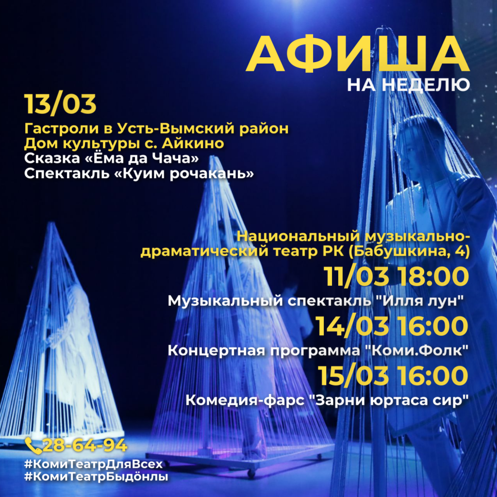 В Национальном театре на этой неделе: 11 марта, 18:00 — музыкальный спектакль «Илля лун» (Ильин день). Билеты: vk.cc/cUY94N 14 марта, 16:00 — театрализованная концертная программа